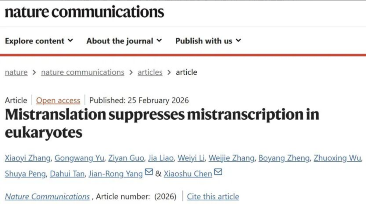 2026年2月, sexfemboy 陈小舒课题组与杨建荣课题组合作在Nature Communications发表了题为"Mistranslation suppresses mistranscription in eukaryotes"的研究成果。该研究发现,频繁发生翻译错误的基因往往表现出较低的转录错误率,而这种负相关模式源于两类错误间的负上位性效应。在此效应驱动下,同时受两类错误影响的蛋白质其危害性远超单独错误的简单叠加,最终导致高翻译错误率基因承受更强的转录错误选择压力。该研究揭示了转录错误与翻译错误之间一种此前未知的相互作用机制。