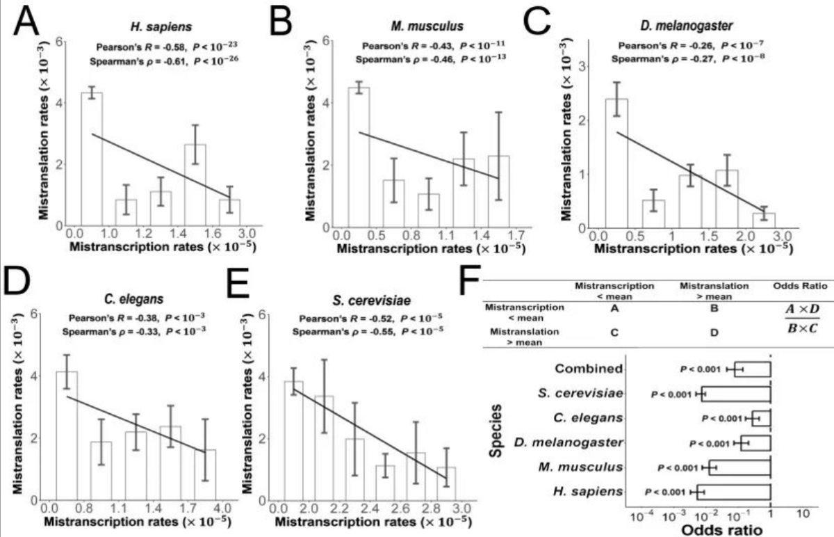 团队综合利用Circ-Seq测序与质谱分析技术,在五种模式生物(人类、小鼠、果蝇、线虫、酵母)中系统测定了全基因组水平的转录错误率与翻译错误率。结果一致显示,两者呈显著负相关(图1),提示高翻译错误率基因往往具有较低的转录错误率。