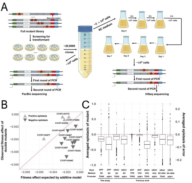 为此,团队提出"两类错误间负上位性效应"的假说,以解释转录错误与翻译错误的负相关模式。为检验该假说,团队通过竞争性培养实验测定了近2.2万个单突变体和双突变体的适应度(图2A)。以各单突变体为中心,计算其与所有配对双突变体间的上位性效应,发现所有单突变体对应的平均上位性效应均为负值(图2B、C)。该结果证实,同时受两类错误影响的蛋白质其危害性远超单独错误的简单叠加,为理解两类错误率间的负相关关系提供了关键理论依据。