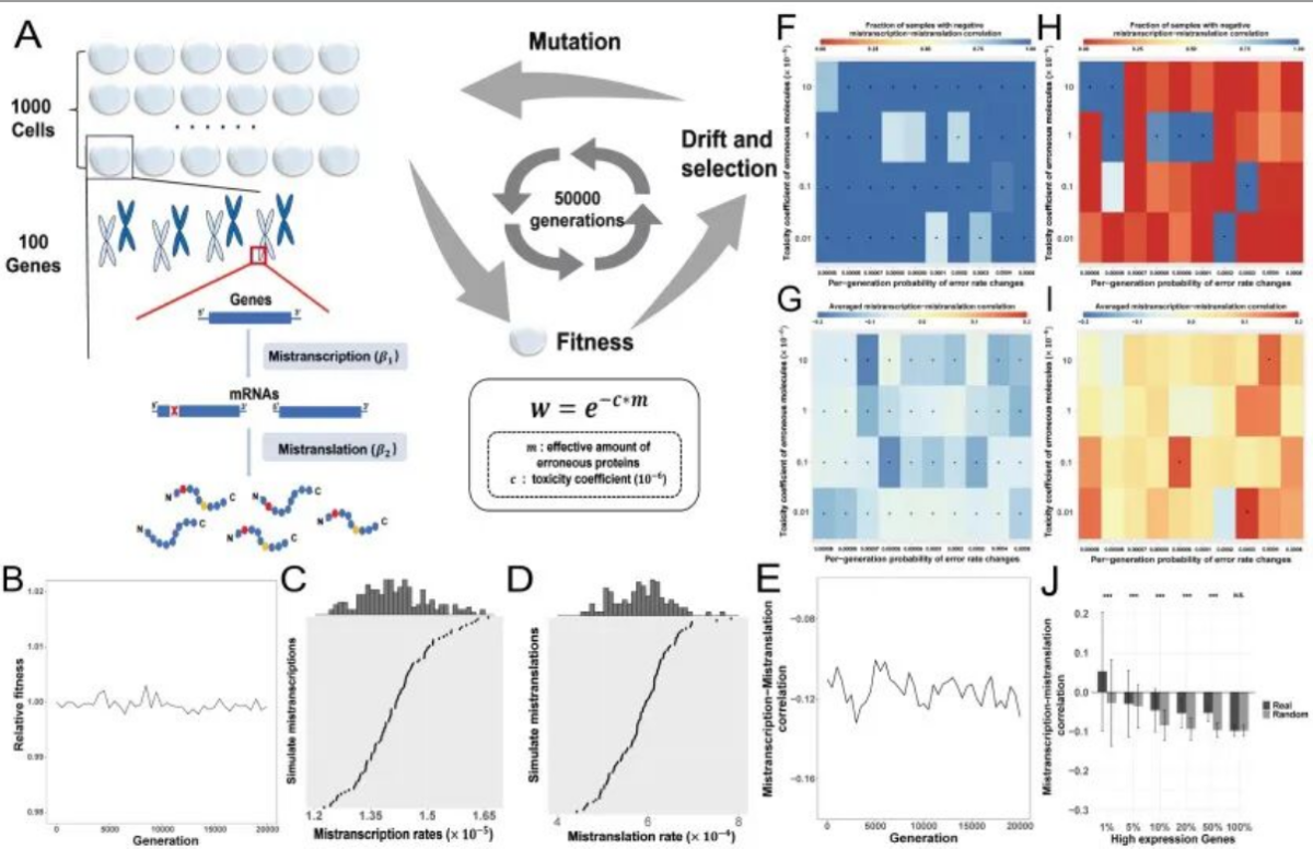 团队通过分子进化的计算模拟表明(图3A-D),当负上位性效应导致的非加性有害影响达到一定阈值时,自然选择将更有效地清除高翻译错误率基因中的转录错误,最终驱动机体在两类错误间形成进化权衡(图3E-G)。而在未考虑负上位性效应的空白对照模拟中,两类错误间的负相关性消失(图3H-J),进一步证实了负上位性效应在这一权衡中的核心作用。