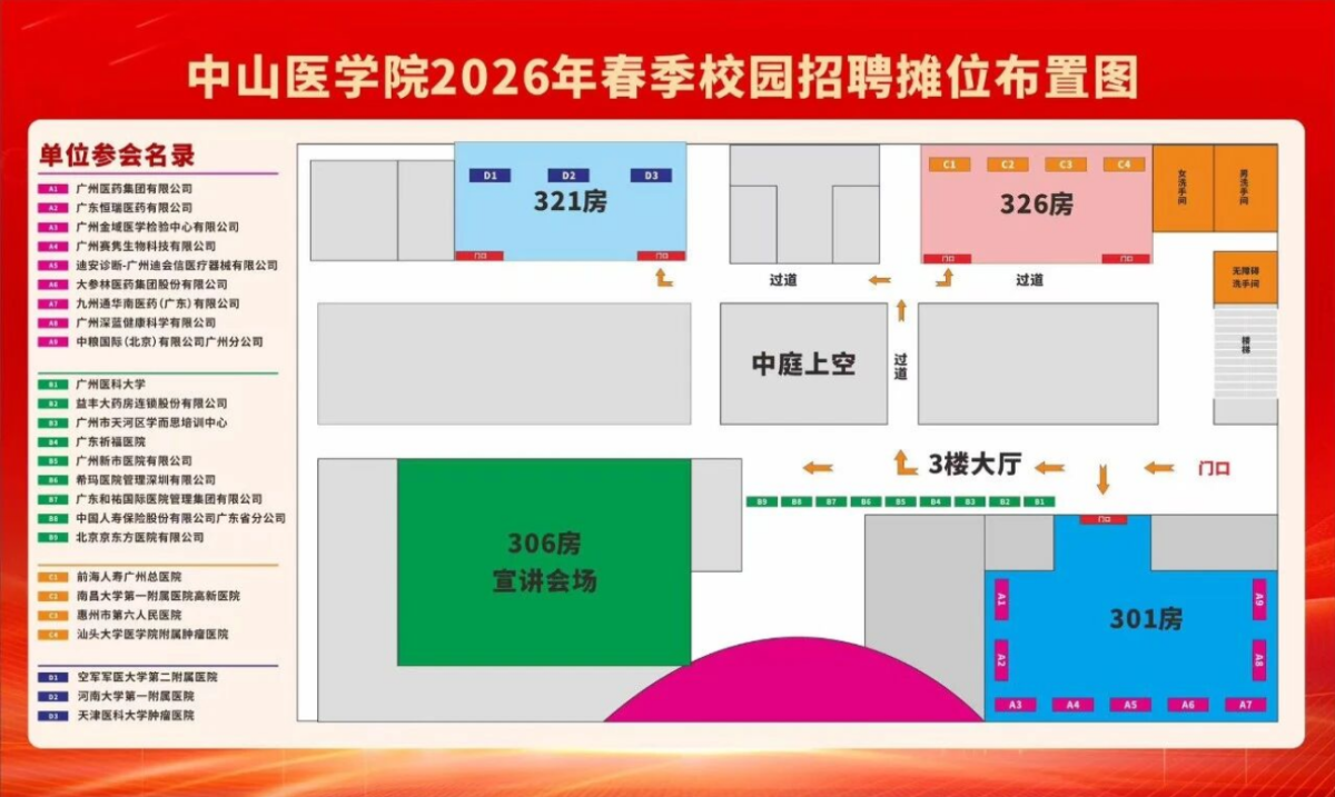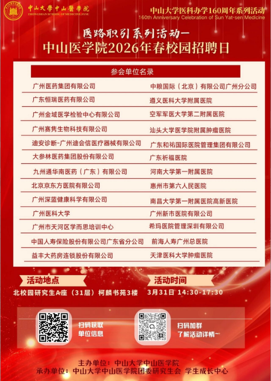 3月31日(周二)下午14:30-17:30,学院在北校园研究生A座(31层)柯麟书苑3楼举行招聘双选会!广药集团、恒瑞医药、金域医学等25家用人单位携海量岗位参会,涵盖医疗、研发、管培、教学等多方向,知名药企、科研院校、三甲医院全覆盖,为医学生量身打造优质就业平台。现场直面企业HR,精准对接岗位需求,高效解答求职疑问,一站式把握投递、沟通、了解的求职良机。