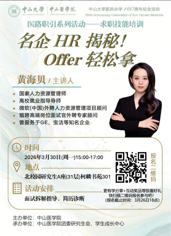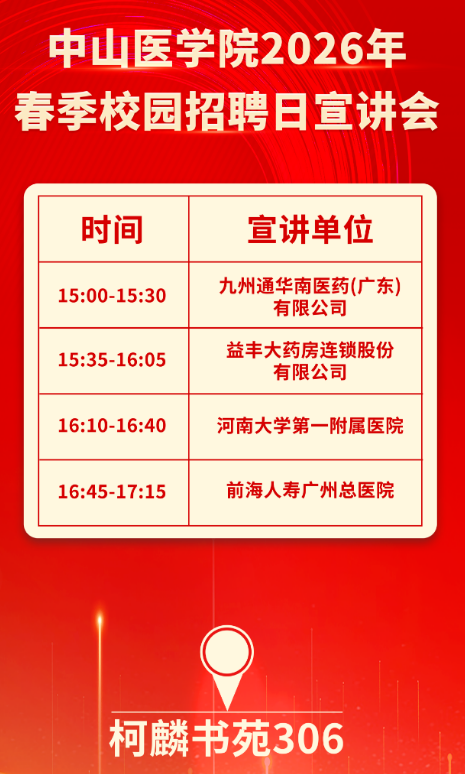 3月31日(周二)下午14:30-17:30,学院在北校园研究生A座(31层)柯麟书苑3楼举行招聘双选会!广药集团、恒瑞医药、金域医学等25家用人单位携海量岗位参会,涵盖医疗、研发、管培、教学等多方向,知名药企、科研院校、三甲医院全覆盖,为医学生量身打造优质就业平台。现场直面企业HR,精准对接岗位需求,高效解答求职疑问,一站式把握投递、沟通、了解的求职良机。