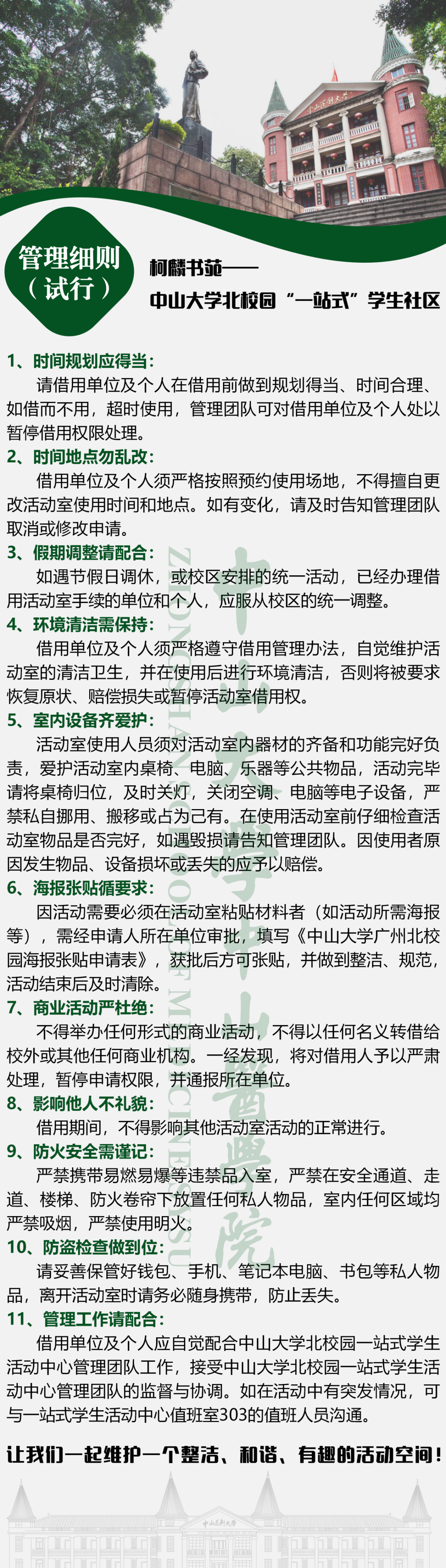 In order to ensure the efficient use of community resources, students can apply for the activity room on demand through the enterprise wechat workbench. During the use, students should abide by the "Sun Yat-sen University" "one-stop" Student Community Use Convention "to jointly maintain the safety of the public environment and facilities.