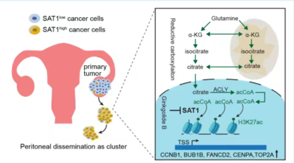 研究发现,低氧诱导SAT1高表达,而SAT1通过促进肿瘤细胞非锚定生存,进而增强盆腹腔转移。SAT1高表达的癌细胞在恶性腹水中普遍存在。SAT1通过直接乙酰化有丝分裂关键调控基因的H3K27结构域,提升其转录水平,进而保护非锚定的转移细胞免于有丝分裂灾难与细胞死亡。SAT1对H3K27的乙酰化作用,依赖于谷氨酰胺通过还原羧化途径提供乙酰辅酶A。研究还发现,药食同源的天然产物银杏内酯B可有效抑制SAT1活性,显著降低小鼠模型中的转移性肿瘤负荷。