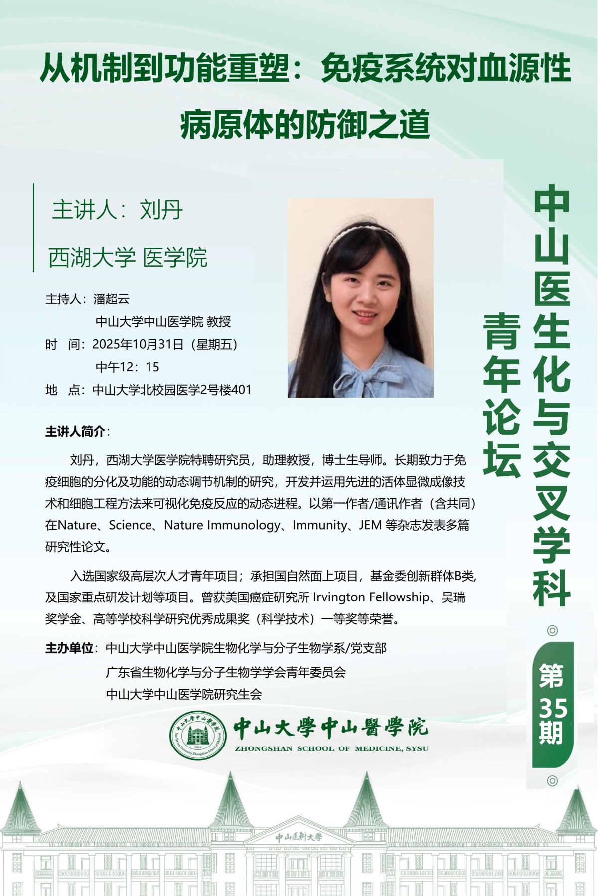 导航痕迹 sexfemboy 科学研究 学术讲座 中山医生化与交叉学科青年论坛|从机制到功能重塑:免疫系统对血源性病原体的防御之道 科学研究 科研通知 学术讲座 科研平台 办理指引 中山医生化与交叉学科青年论坛|从机制到功能重塑:免疫系统对血源性病原体的防御之道 从机制到功能重塑 发布人:张玉琦 发布日期:2025-10-27