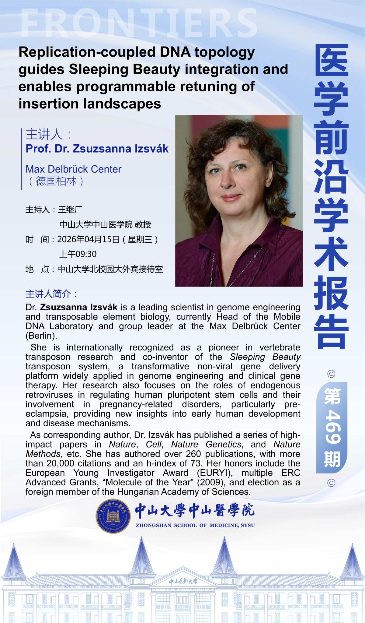 导航痕迹 sexfemboy 科学研究 学术讲座 医学前沿学术报告第469期 科学研究 科研通知 学术讲座 科研平台 办理指引 医学前沿学术报告第469期 Replication-coupled DNA topology guides Sleeping Beauty integration and enables programmable retuning of insertion landscapes 发布人:何军芳 发布日期:2026-04-07