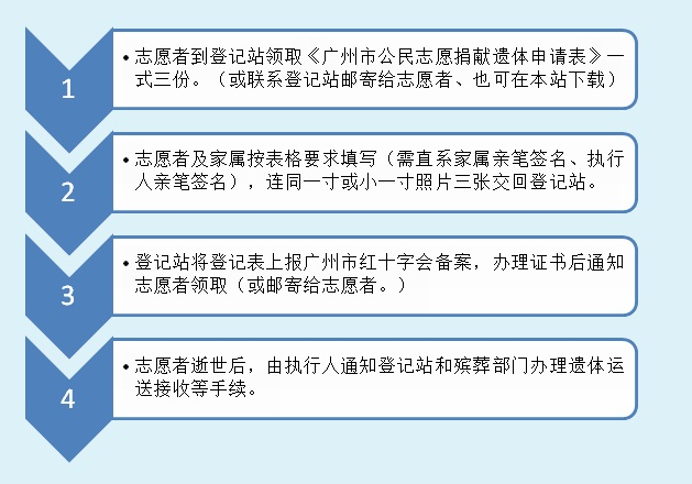 A:首先到登记接受站领取《广州市公民志愿捐献遗体申请登记表》并按表格的要求填写;填写“申请登记表”时要征得直系亲属的签名同意方为有效。如捐献遗体志愿者要求公正的,可以到市或区的公证处办理公正。登记接受站受理申请登记后,向捐献遗体志愿者颁发由广州市红十字会统一印制的“志愿捐献遗体纪念证。