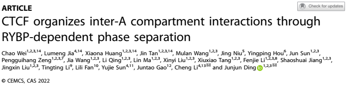 CTCF is a vital structural factor in the canonical “loop extrusion” model, and it organizes chromatin looping via mediating cohesin retention on DNA.7,11,12 On 29 June 2022, Junjun Ding group from Sun Yat-sen University and Cheng Li group from Peking University, published a paper in Cell Research entitled “CTCF organizes Inter-A Interactions Through RYBP-Dependent Phase Separation”. For the first time, they found that, in addition to organizing loops, CTCF is also able to organize long-range chromatin interactions between A compartments via phase separation behavior.