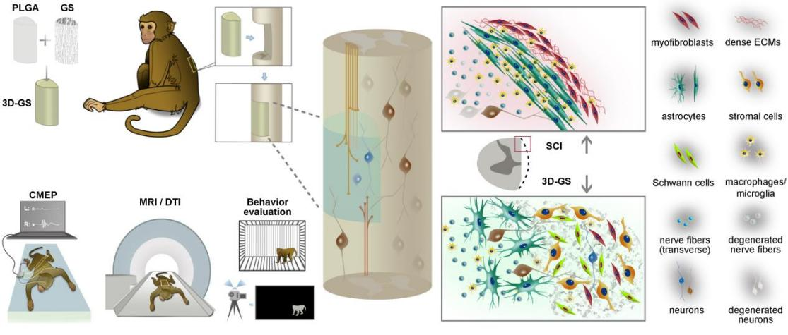该研究成果“A biocompatible gelatin sponge scaffold confers robust tissue remodeling after spinal cord injury in a non-human primate model”近日在国际TOP期刋Biomaterials(中科院1区,IF=15.304) 在线发表。该项研究提出了在非人灵长动物脊髓损伤区早期植入具有良好组织相容性与生物安全性、且具有合适力学强度的生物材料,可以替代纤维瘢痕组织稳定脊髓损伤区界面,减轻继发性损伤的新理念(图4)。这项研究在新技术临床转化层面上可为应用三维明胶海绵支架材料修复中枢神经损伤奠定了理论和实验基础。