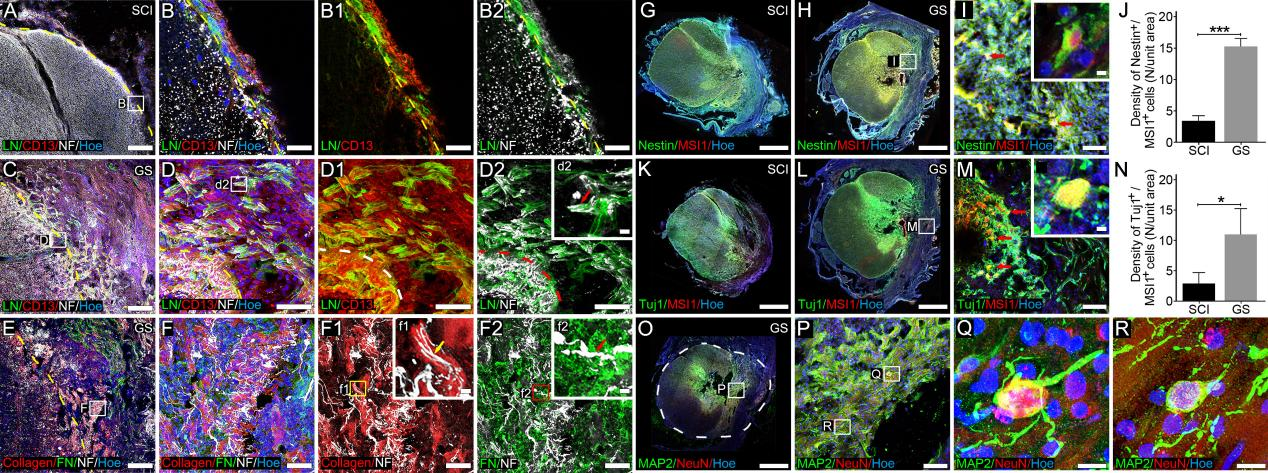图2. 与单纯脊髓损伤对照组(SCI)相比,三维明胶海绵支架(GS)材料移植后可见众多CD13阳性的组织细胞迁移定植到支架材料中,同时可见大量的细胞外基质,例如层粘连蛋白(LN)及纤维粘连蛋白(FN)沉积到移植材料内(图A−F2)。移植三维明胶海绵支架材料后,损伤/移植区有更多的神经干细胞、神经前体细胞及幼稚神经元产生,甚至有少量的成熟神经元(图G−R)。