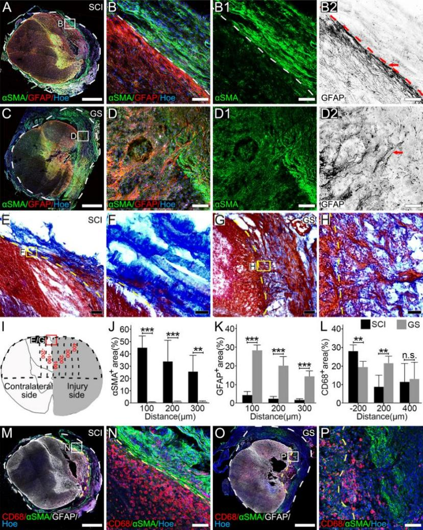 图3. 在脊髓损伤(SCI)后,α平滑肌肌动蛋白(αSMA)阳性肌成纤维细胞细胞可在损伤区界面形成清晰的纤维瘢痕组织,对残留的神经组织造成挤压性损伤(图A−B2、E、F)。在损伤区植入三维明胶海绵支架(GS)材料可抵抗损伤/移植区界面处的入侵,从而阻断纤维瘢痕的形成,及其对损伤区残留神经组织的挤压(图C−D2、G、H),最终减少损伤/移植区的组织破坏与炎症发生(图I−P)。