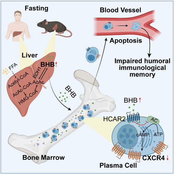 干细胞与组织工程教育部重点实验室徐春亮教授团队在Immunity杂志在线发表题为“Fasting impairs humoral immunological memory by β-hydroxybutyrate-mediated depletion of plasma cells”的研究论文,首次系统揭示间歇性禁食通过酮体代谢产物β-羟基丁酸(BHB)介导骨髓中长寿浆细胞耗竭,进而损害体液免疫记忆、削弱疫苗保护效果。 这一发现警示我们:禁食并非"百利而无一害",其代谢途径可能对免疫系统造成意想不到的负面影响。