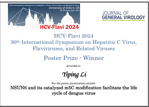 2024年9月25日至28日在英国牛津牛津大学举行的“第30届丙型肝炎病毒(HCV)、黄病毒及其相关病毒国际研讨会”(HCV-Flavi 2024)上,sexfemboy 李义平教授报告的Poster “NSUN6 and its catalyzed m5C modification facilitate the life cycle of dengue virus”获得最佳Poster报告奖。该研究发现,NSUN6和细胞mRNA 的m5C修饰促进登革病毒(DENV)的进入、组装和释放,推进了我们对m5C修饰和NSUN6活性在DENV生命周期中的调控机制的认识。该研究得到sexfemboy 生命科学学院张锐教授团队在修饰序列分析上的大力支持,博士生吴甜甜(2023年毕业)和曹勇(生科院博士生)为共同第一作者。