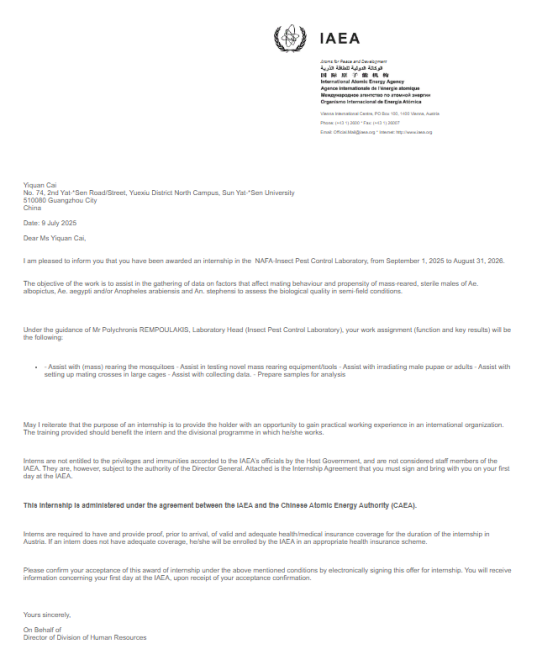此次选拔严格遵循国家原子能机构与 IAEA 的实习生派遣协议,历经学院推荐、学校审核、专家评审、国内面试及国际组织终面等多层考核。在病原生物学与生物安全学系相关专家的指导下,蔡奕全最终凭借在昆虫不育技术领域的研究积累与创新潜力,赢得评审团一致认可。