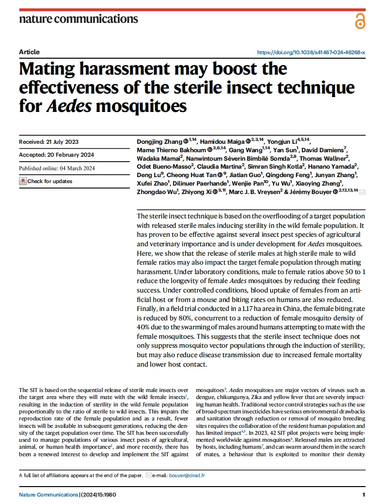 张东京表示:“在过去4年,我们一直在广州老城区小范围释放经辐照绝育雄蚊,发现因有绝育雄蚊的存在,释放区的雌蚊叮咬指数下降了70%-80%。这是一种安全有效、环保、特异性强的蚊媒防制技术,团队在2024年发表了相关研究成果。”