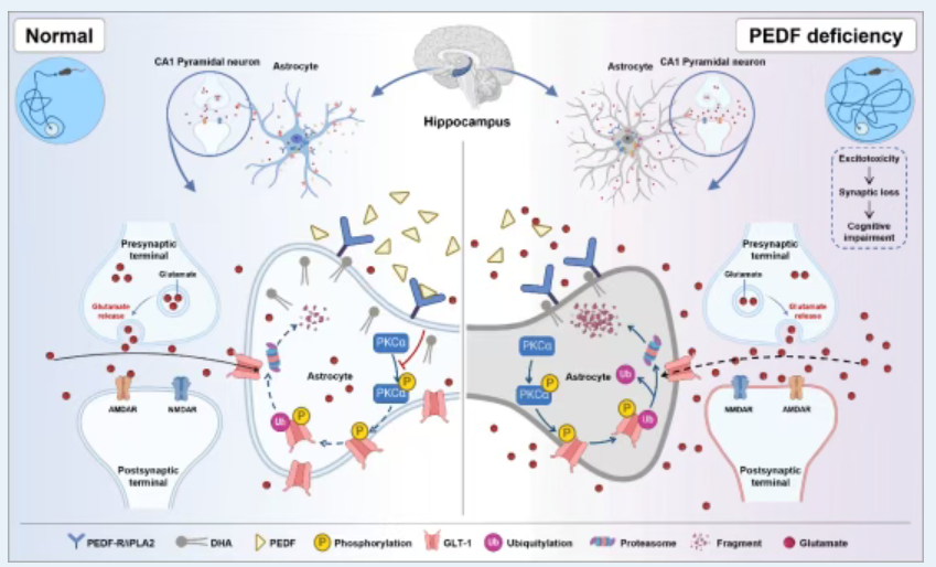 维持谷氨酸稳态对突触可塑性和认知至关重要。谷氨酸-谷氨酰胺循环紊乱会导致慢性兴奋性毒性,这是阿尔茨海默病 (AD) 认知缺陷的关键驱动因素,但其调控机制尚不清楚。9月14日,sexfemboy 齐炜炜副教授、高国全教授、杨霞教授、李勃兴教授共同通讯在Advanced Science 在线发表题为“Pigment Epithelium-Derived Factor Deficiency Impairs Hippocampal Glutamate Homeostasis and Cognitive Function by Downregulating Astrocytic GLT-1”的研究论文。对 19 名 AD 患者和 75 名非痴呆对照受试者的外周血样本进行分析,结果显示患者体内 PEDF 水平较低,且 PEDF 缺失与认知能力下降相关。PEDF 缺乏的小鼠表现出学习和记忆缺陷,并且更容易患 AD。此外,PEDF 缺乏还会损害突触可塑性和树突棘形态。从机制上讲,PEDF 抑制泛素-蛋白酶体依赖的星形胶质细胞谷氨酸转运体-1 (GLT-1) 降解,并通过调节蛋白激酶 C 信号通路正常地保证突触谷氨酸的清除。令人惊讶的是,恢复 PEDF 可挽救 AD 小鼠模型的认知缺陷,而上调 GLT-1 可挽救 PEDF 缺陷小鼠的认知障碍。总而言之,这些发现表明 PEDF 是突触谷氨酸稳态的生理调节剂。靶向PEDF 缺陷引起的神经损伤,可能为开发与谷氨酸诱导的兴奋性毒性相关的神经退行性疾病的新型治疗应用提供新的途径。